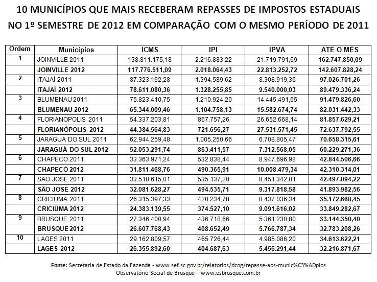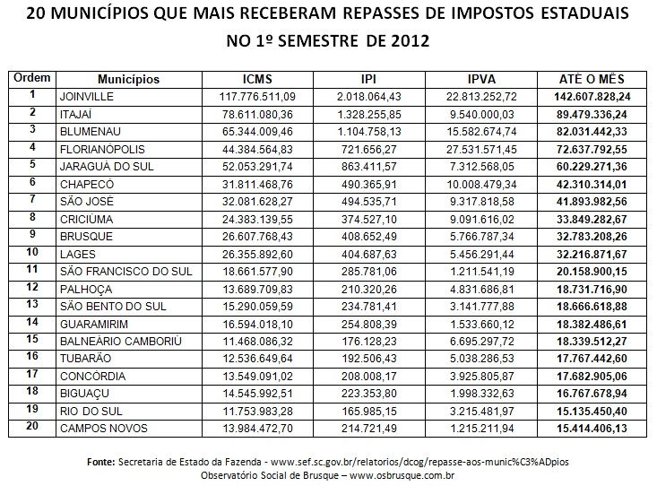 Do total transferido, Brusque se posiciona como o nono município que recebeu maior valor nos repasses, somando um montante de R$ 32.783.208,26, número 1,08% menor que no primeiro semestre de 2011.