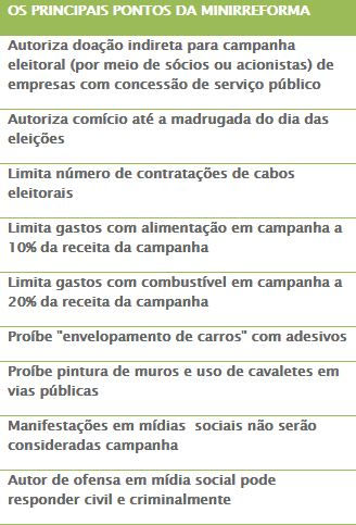 Entre as mudanças, está relacionado o fato de que os partidos só poderão trocar seus candidatos até 20 dias antes do pleito, não permitindo, por exemplo, que um candidato ficha suja concorra ao cargo e seja substituído apenas de última hora. O texto também impossibilita que o candidato à presidência da República utilize os meios de comunicação em cadeia nacional para sua ascensão e ataque à oposição.