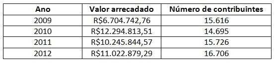 No período de 2009 a 2010 houve um aumento considerável (83,37%) no valor arrecadado e uma queda no número de contribuintes (5,90%). Logo, como mostram os valores, a crescente não ocorreu devido ao número de contribuintes e sim pela Revisão da Planta Genérica de Valores (LCM 153/2009), que provocou a atualização do valor venal do imóvel. Já durante os anos de 2010 e 2011 foi Instituída uma lei complementar (LCM 161/2010) que reduziu a alíquota do IPTU em 25%, o que acarretou em uma queda de 16,67% no valor arrecadado, porém diferente no período anterior, o número de contribuintes aumentou 7%. De 2011 a 2012 houve um aumento de 7,58% no valor arrecadado bem como a no número de contribuintes, que foi de 6,23%. A seguir, quadro do valor arrecadado e o número de contribuinte de acordo com os últimos anos.