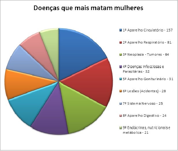 Dentre os fatores que mais mataram, entre homens e mulheres, estão às enfermidades do aparelho circulatório, com 300 no total. Em seguida vêm às doenças que afetam o sistema respiratório, com 205.