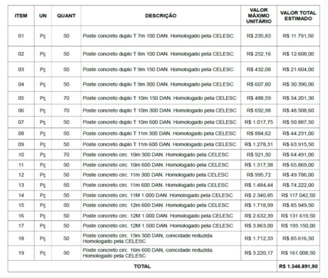 Segundo a observadora presente, as empresas vencedoras foram: Elétrica Santa Fé LTDA., dos itens 1,2 e 18; Indústria de Postes Indaial LTDA., itens 6, 11, 13, 15, 16, 17 e 19; Gomes Indústria e Comércio de Artefatos de Cimento LTDA., nos itens 3, 4, 5, 7, 8, 9, 10, 12, 14.