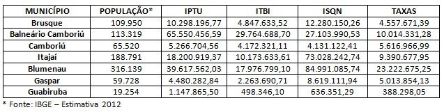 O Observatório Social de Brusque e Região fez um estudo das principais receitas tributárias dos municípios da região, com a finalidade de que o contribuinte brusquense entenda quanto paga de tributo municipal, e qual a relação de valores pagos em Brusque, em relação a outros municípios da Região. É necessário, porém fazer duas observações importantes, para que a interpretação seja melhor assimilada: